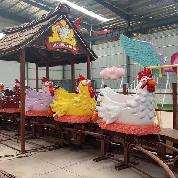 With colorful chicken-shaped ride cars, a cozy “chicken coop” station, and a gentle track system, this ride offers a safe, fun, and immersive experience for young children and parents alike.
